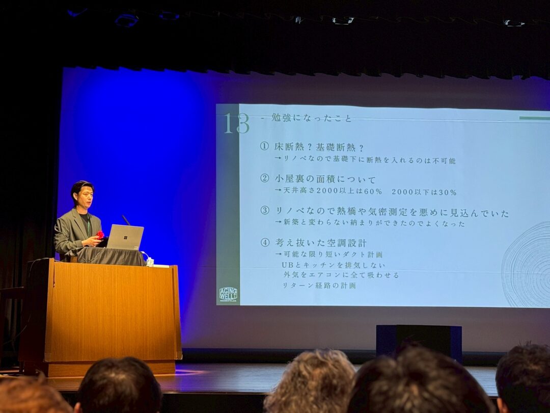 今回の発表は、僕自身の実家をリノベーションし、パッシブハウスに挑戦したプロジェクトについてでした。高性能住宅の世界では新築が前提になることが多いと思いますが、今回僕が取り組んだのは、壊すのではなく整えるというアプローチでした。古い家をすべて壊して建て替えるのではなく、残せるものは残しながら性能を整えていく。断熱や気密、設備を見直し、暮らしの質を上げていく。既存住宅でも、手を入れることで家は大きく変わります。その挑戦を、自分自身の暮らしの中で実験しているようなプロジェクトでもあります。