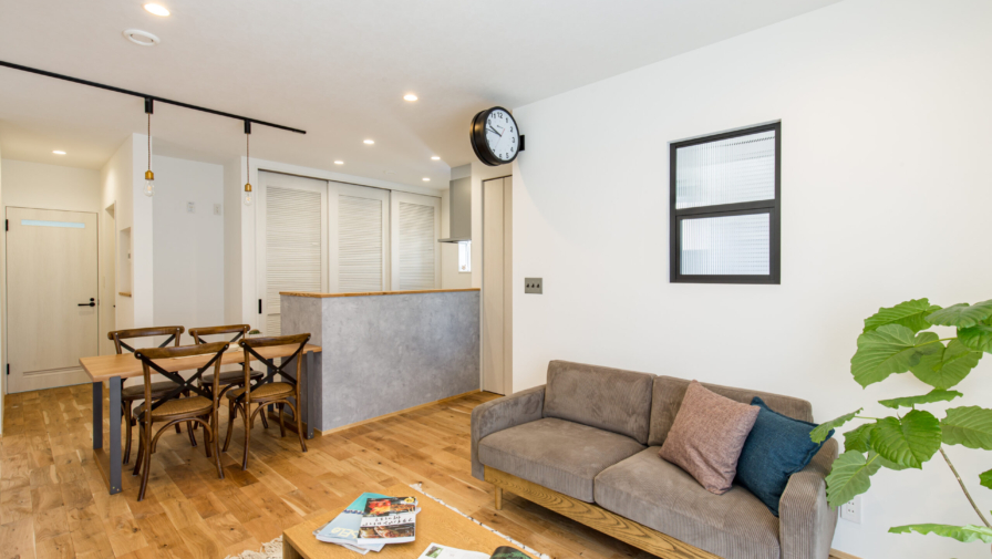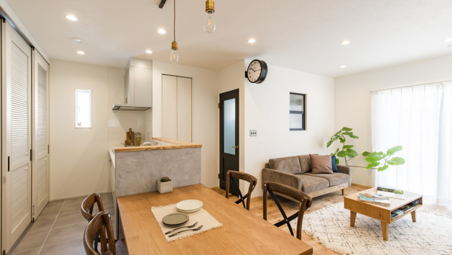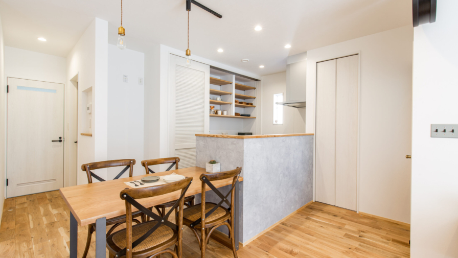 キッチンのすぐ隣にダイニングスペースを配置することで配膳や食器の片づけがスムーズにできます。家事、料理をしながらも家族と顔を合わせて会話ができるよう設計しました。