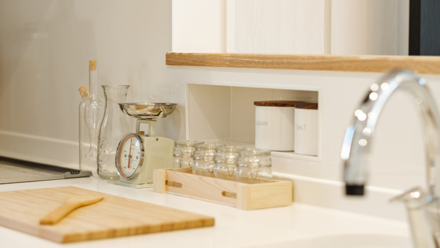 気を付けていてもキッチン回りはごちゃごちゃしてしまうもの。そこでごちゃごちゃ部分をすっぽり隠してしまえる扉をつけて空間をスッキリ見せる工夫をしました。