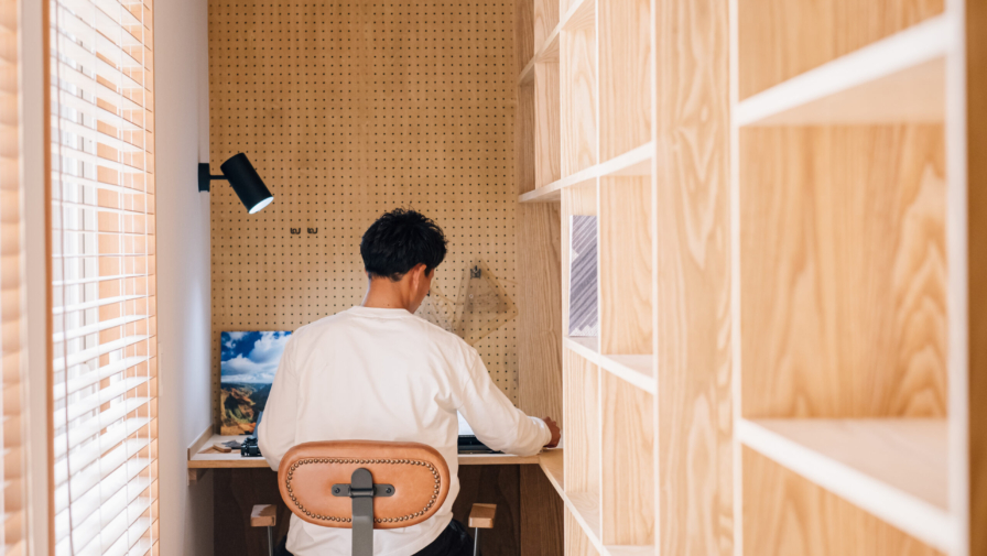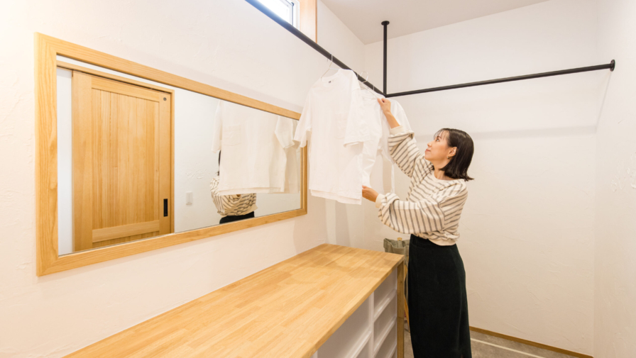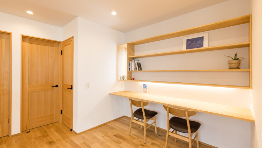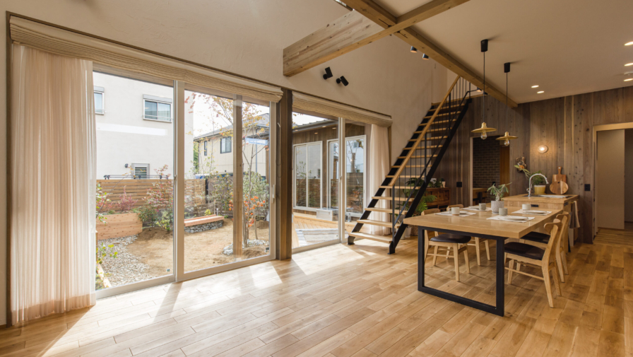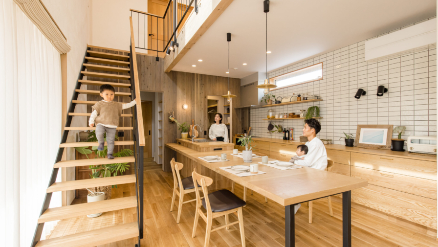 家の中心にドンと構える木のキッチンはこの家の主役とも言える存在です。「友人を招いて楽しい時間を過ごしたい」とご主人の希望により最大8人がゆったり掛けれるダイニングをLDKの中心に配置しました。シンクカウンターとダイニングを横並びにすることで洗い物などを運ぶ動作が減り、ストレスなく片付けることができます。木製のキッチン天板は年月をかけ使い込むことで新品には出せない本物の木ならではの味わいが出てくるでしょう。この場所でどんな人たちとどんな話をし、どんな料理を楽しむのか考えるだけでワクワクします。