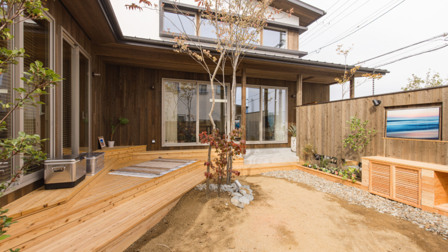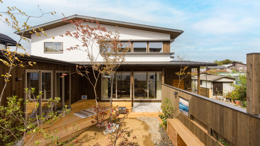 L字に対して斜めにかかるウッドデッキには床・椅子・テーブルの要素が全て入っていて、それぞれが自由な使い方で楽しめるように造られています。このデッキの上には深い軒がかかっていて雨の日も座って外を楽しむことができます。庭の中心には家族が産地まで足を運び選んだお気に入りのアオダモとヤマボウシが植えられました。風に揺らぐ木々も草むしりの時間もデッキに腰かけて飲むコーヒーも、日常にあふれている何気ない瞬間を愉しむAGING GARDENがまた一つ生まれました。