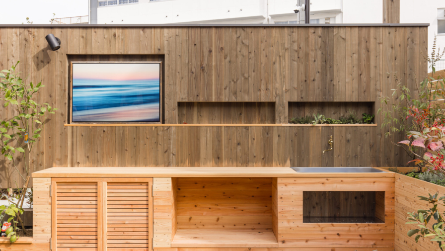 庭にあるアウトドアキッチンスペースではイチゴやレモン、ハーブや野菜などが近くで育てられていて季節ごとの野菜や果実を料理に使うことができます。他にも絵や写真飾ったり、壁をスクリーンにして映画を観たりと様々な使い方ができます。本来であれば道路からの視線を遮るためだけの壁ですが、遊び心を加えることでお庭時間を充実させる”遊び道具”へと進化させました。