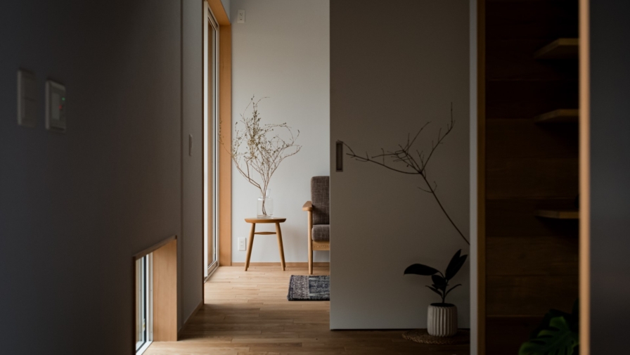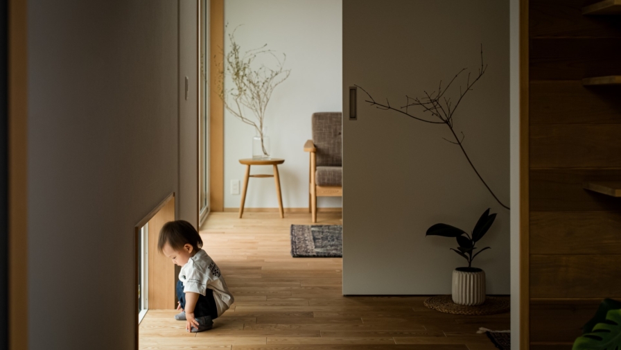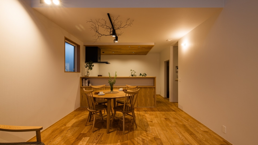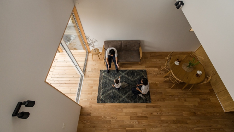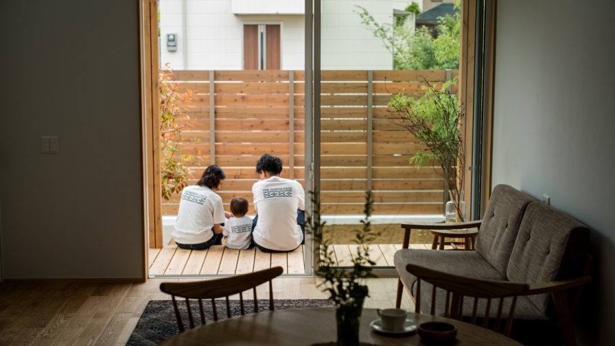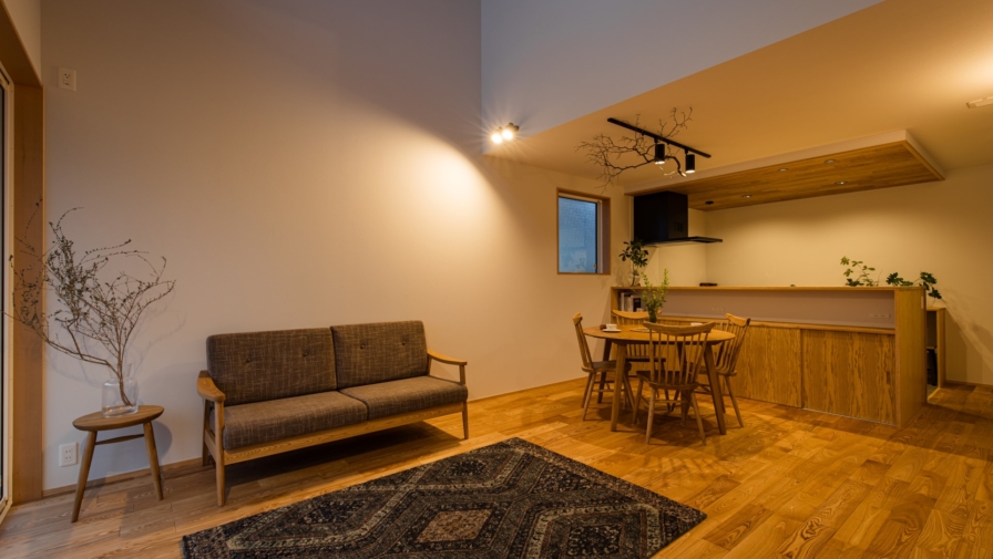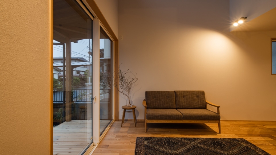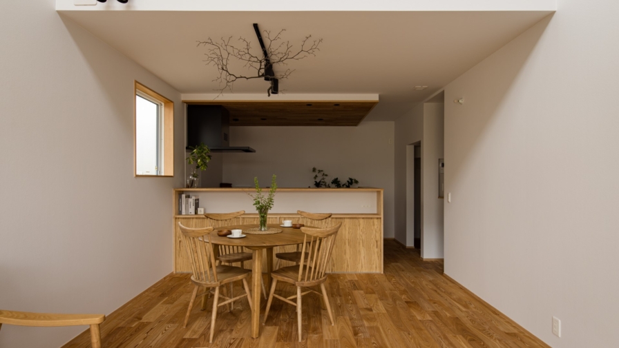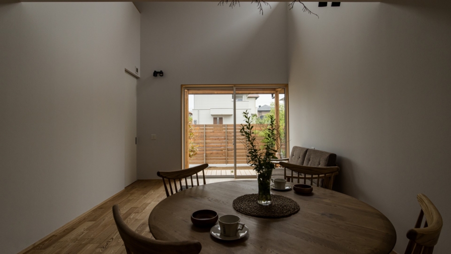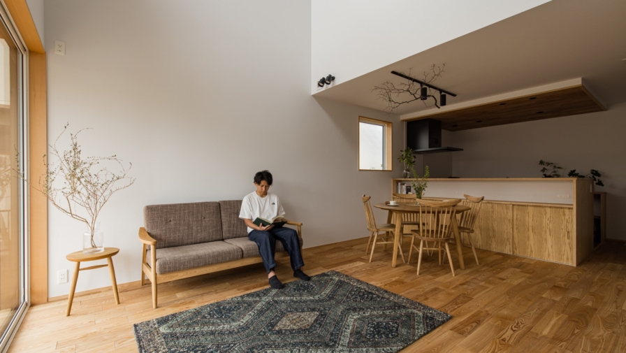 築50年ほどの民家が立ち並ぶ住宅街で古家付きの土地を購入し、解体後に新築工事をしました。「将来1階だけで暮らせる半平屋」のオーダーでした。限られた敷地の中で日の光を取り入れながら、視線をさえぎりながらリラックスできる空間をつくりました。