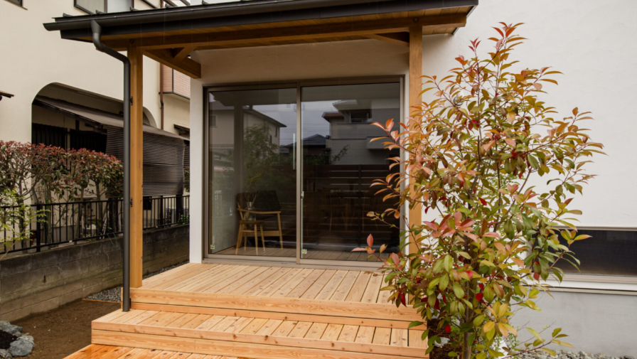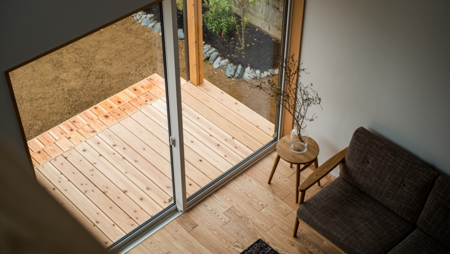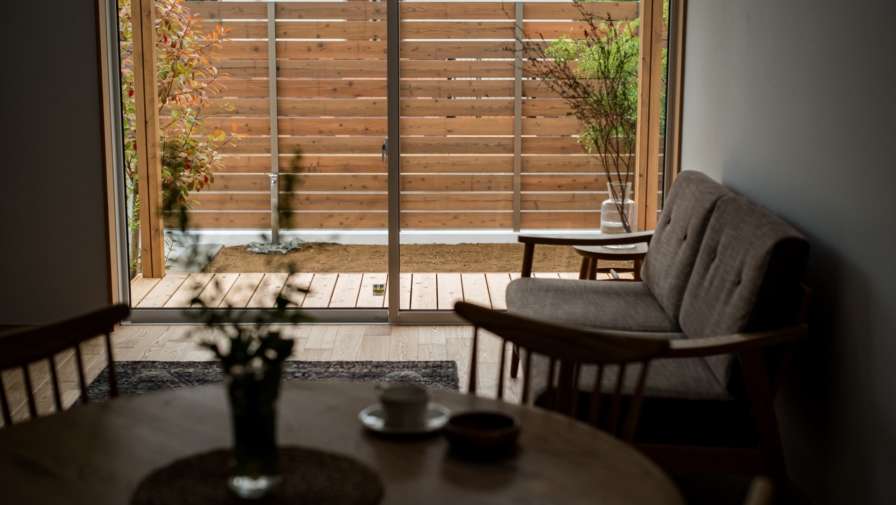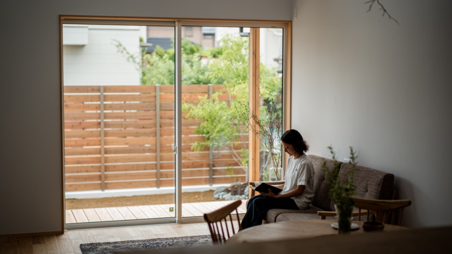 今回の建築地は東西北と住宅に挟まれた敷地で、視線が抜ける先が道路面と空しかありませんでした。本来なら道路からの視線をさえぎりたいところなのですが、今回は大きな窓を付けることにしました。人通りの多い昼間は、目隠しの用途で作ったウッドフェンスと樹木の緑が良い感じに視線を遮ります。昼間はガラスが反射して意外と中が見えにくく、夜はレースカーテンなどで簡単に視線をさえぎることができます。人目を気にせずリラックスできるリビングになりました。