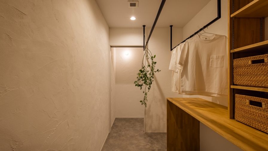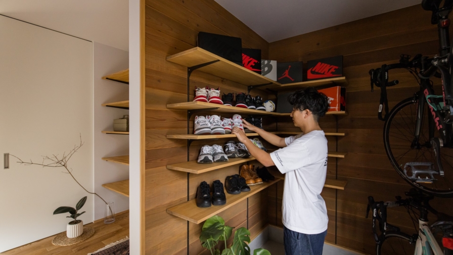玄関先の大きめの土間収納では通勤で使うロードバイクやご主人のスニーカーコレクションが飾られました。板を貼ることにより、見た目もよく、自転車のタイヤの跡が壁についても目立ちにくくなりました。実用性とデザインのどちらも叶える素敵な空間になりました。