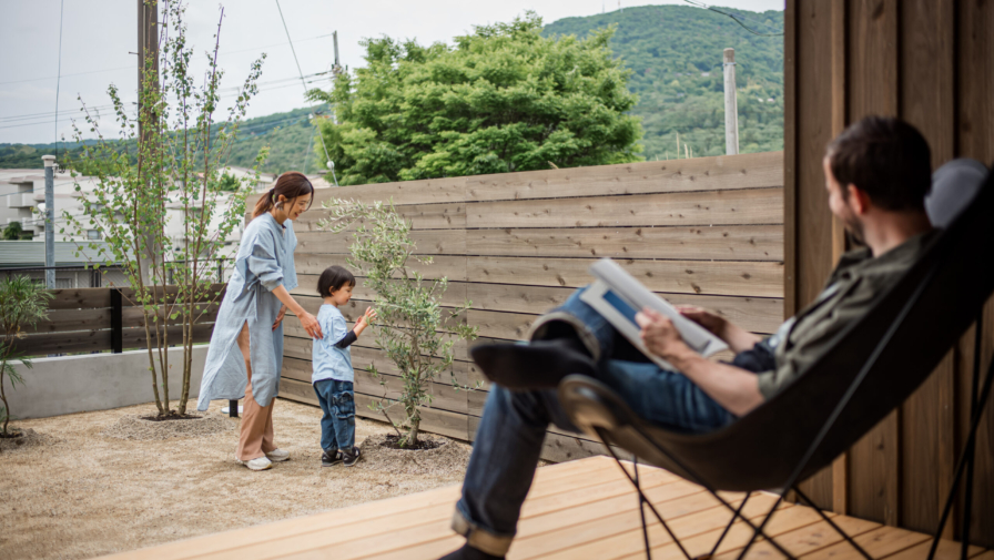 リビングとお庭の中間領域として、広めのデッキスペースを設けました。雨の日は雨除けに、夏の暑い日には日陰を作り、どんなタイミングでもお庭を愉しんでいただけるような空間に仕上がりました。山並みやお庭で遊ぶ子どもたちを眺めながらのんびりゆっくり過ごしていただけたら嬉しいです。